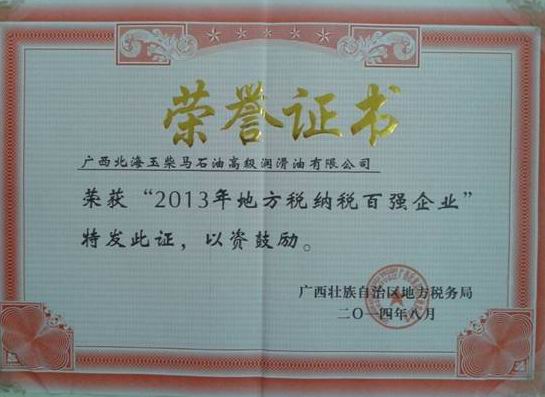 10月10日,廣西北海玉柴馬石油高級(jí)潤(rùn)滑油有限公司獲廣西壯族自治區(qū)地方稅務(wù)局授予“2013年地方稅納稅百?gòu)?qiáng)企業(yè)”榮譽(yù)證書(shū)。