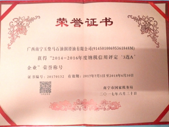 近日,廣西南寧玉柴馬石油潤滑油有限公司榮獲由南寧市國家稅務(wù)局授予的2014~2016年度“納稅信用評定’3連A’企業(yè)”稱號。