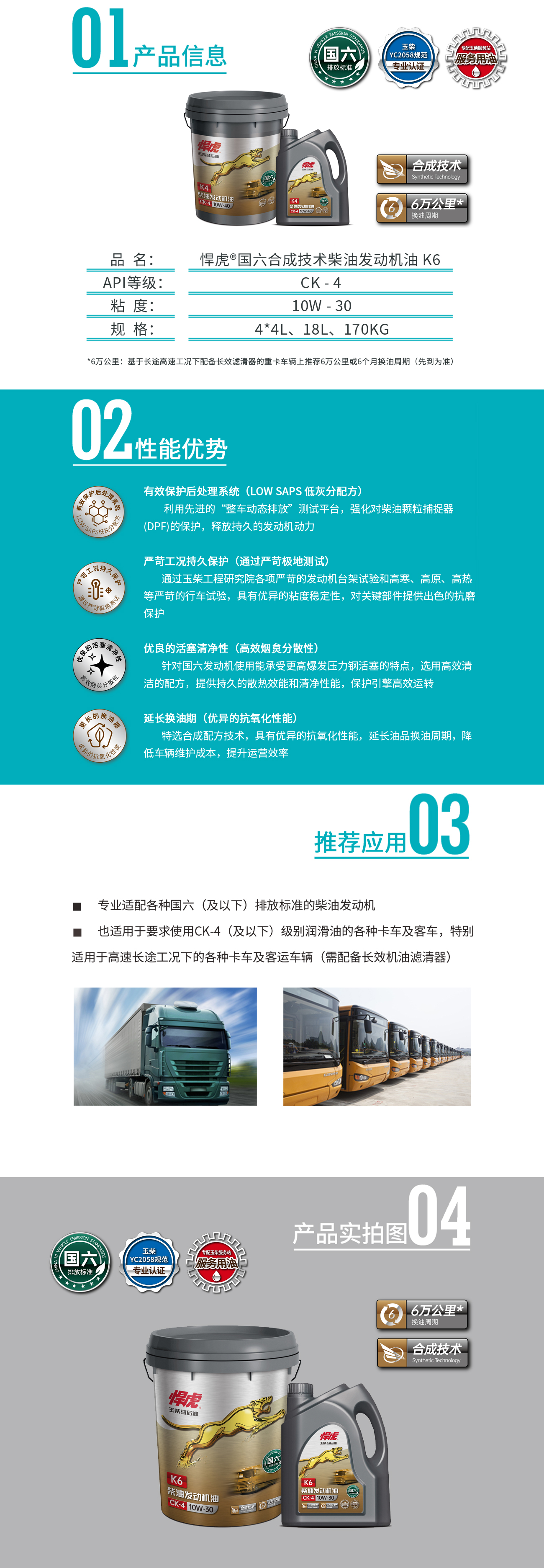 ? 專業(yè)適配各種國六(及以下)排放標準的柴油發(fā)動機 ? 也適用于要求使用CK-4(及以下)級別潤滑油的各種卡車及客車,特別適用于高速長途工況下的各種卡車及客運車輛(需配備長效機油濾清器)
