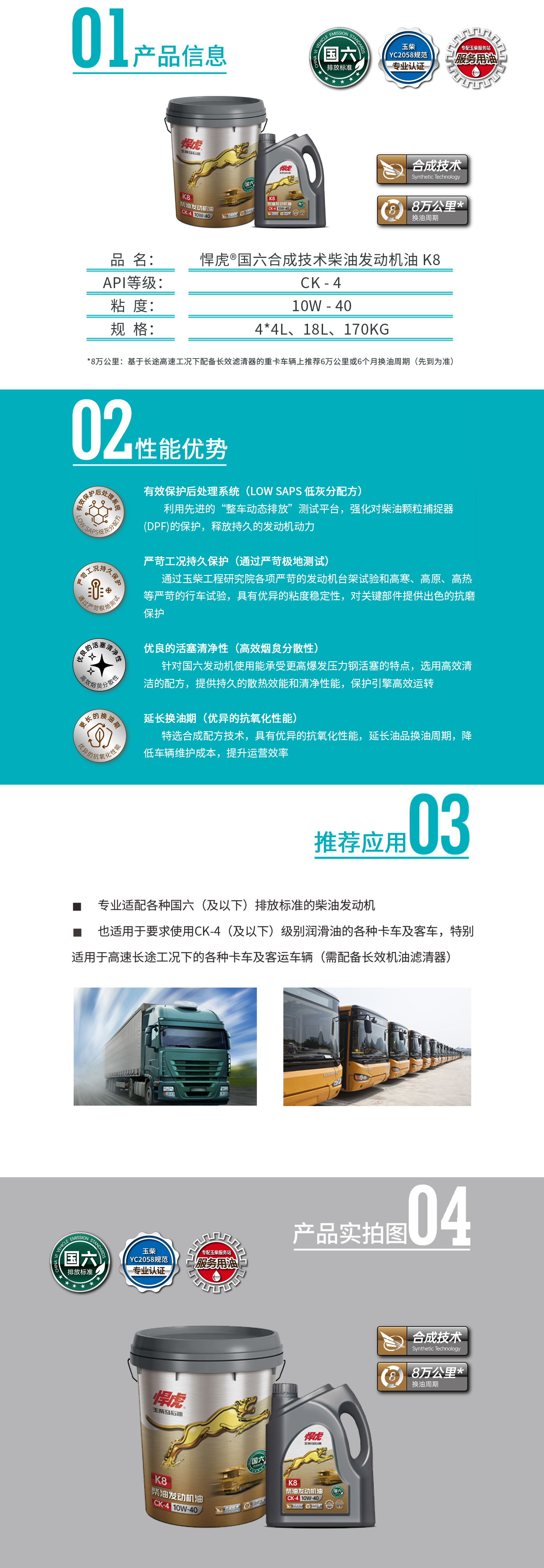 ? 也適用于要求使用CK-4(及以下)級別潤滑油的各種卡車及客車,特別適用于高速長途工況下的各種卡車及客運(yùn)車輛(需配備長效機(jī)油濾清器)