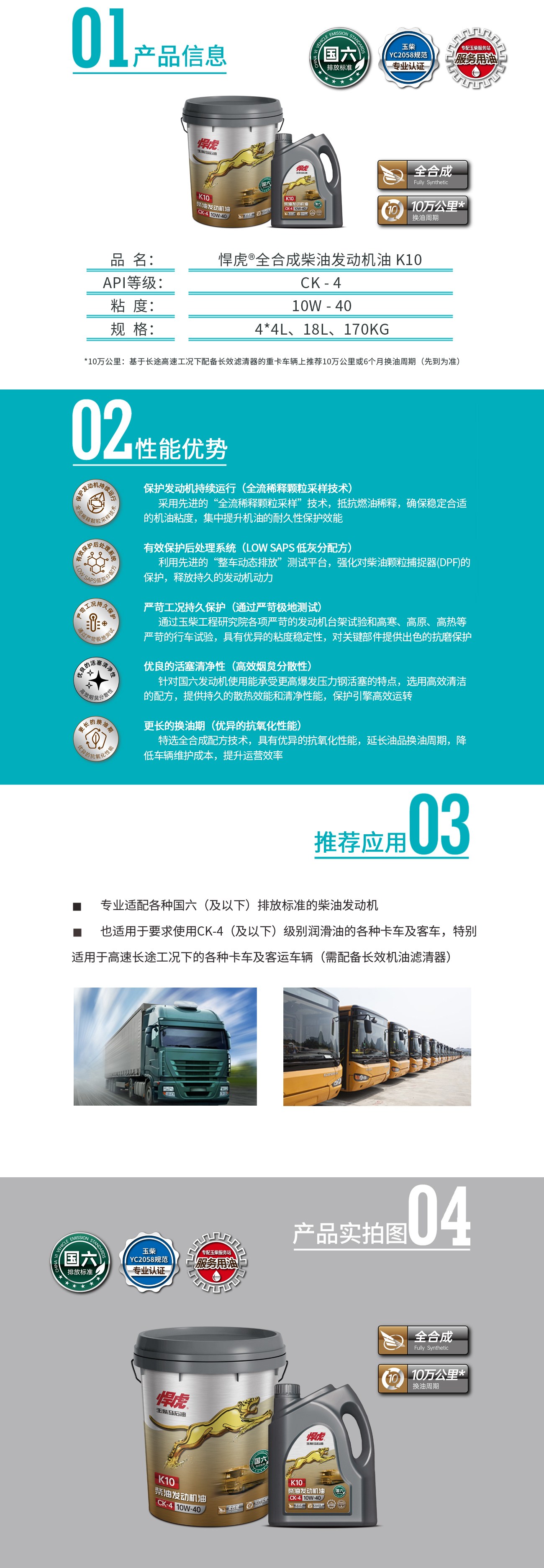 ? 專業(yè)適配各種國六(及以下)排放標(biāo)準(zhǔn)的柴油發(fā)動機 ? 也適用于要求使用CK-4(及以下)級別潤滑油的各種卡車及客車,特別適用于高速長途工況下的各種卡車及客運車輛(需配備長效機油濾清器)