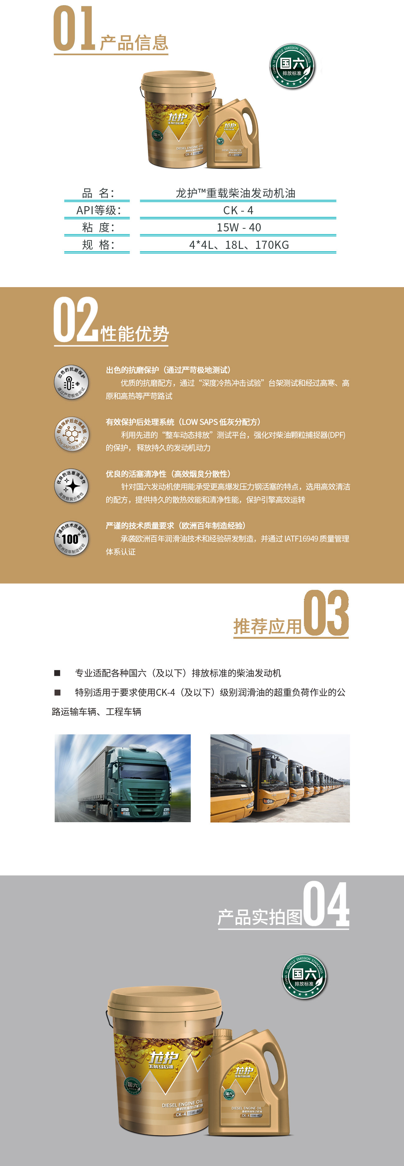 ? 專業(yè)適配各種國六(及以下)排放標準的柴油發(fā)動機 ? 特別適用于要求使用CK-4(及以下)級別潤滑油的超重負荷作業(yè)的公路運輸車輛、工程車輛