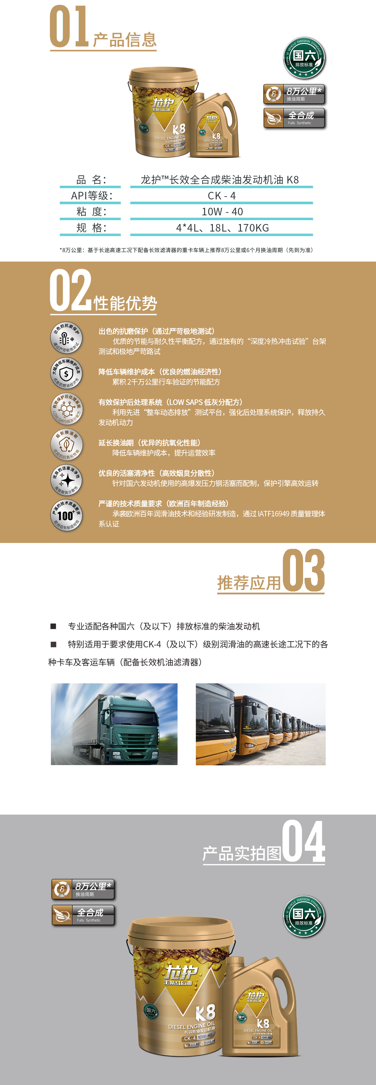 ? 專業(yè)適配各種國六(及以下)排放標(biāo)準(zhǔn)的柴油發(fā)動機 ? 特別適用于要求使用CK-4(及以下)級別潤滑油的高速長途工況下的各種卡車及客運車輛(配備長效機油濾清器)